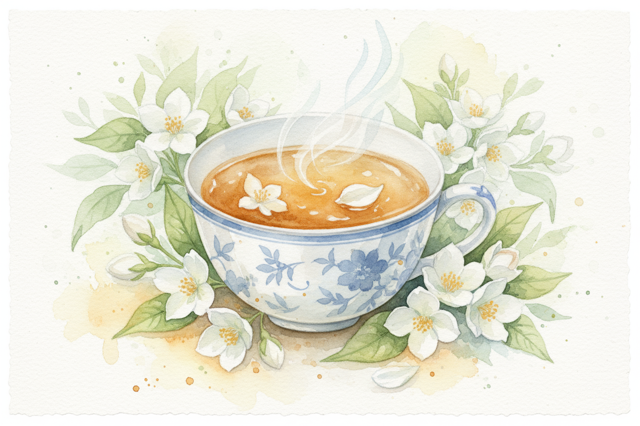 A golden-amber cup delicately infused with freshly picked jasmine blossoms, offering a light, floral elegance for moments of pure refinement.